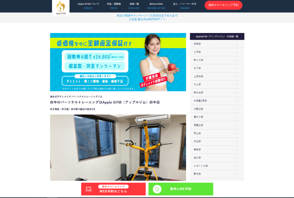 運動習慣がなく、なにから始めればいいかわからなかったのでパーソナルジムを探していたところ、こちらのアップルジムのHPを拝見しました。