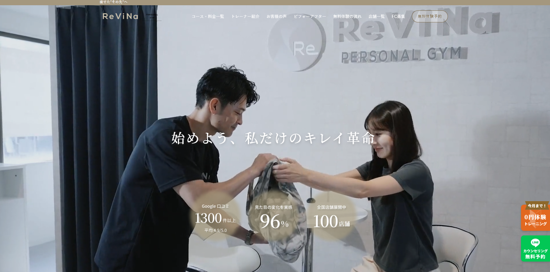 「パーソナルジムReViNa」は、関東・関西を中心に展開する完全個室パーソナルジムです。最大の特徴は、大手の半額以下という圧倒的な低価格設定ながら、採用倍率50倍を突破したコンテスト入賞トレーナーのみが在籍している点。無理な食事制限を行わず「食べて痩せる」指導に加え、コース終了後も2年間無料で相談できるアフターフォローが付いており、リバウンドが不安な方やコスパ重視の方に選ばれています。