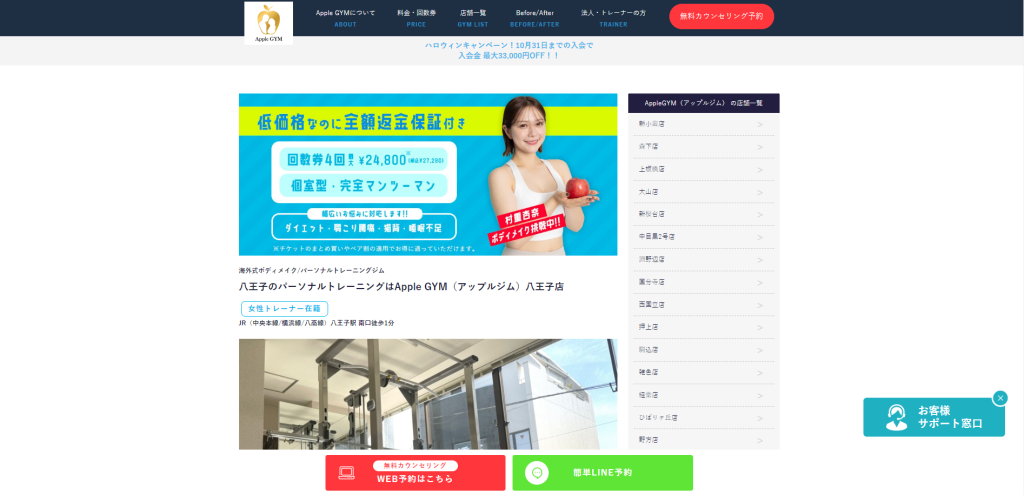 | コース料金 | ・オールタイムプラン 個室ジム通い放題:3,980円(月額) ・トレーナーサポート2回プラン 個室ジム通い放題 パーソナルトレーニング(月2回) :25,080円(月額) |