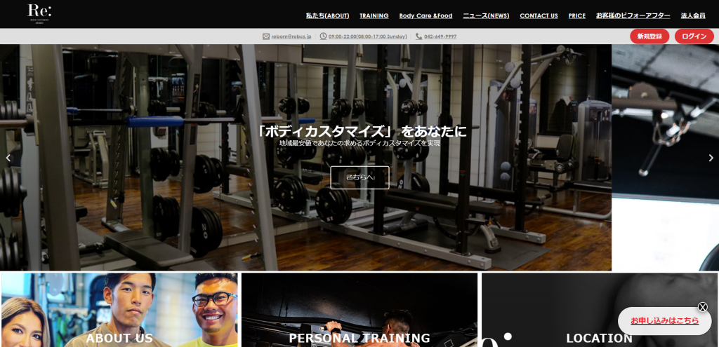 | コース料金 | 【短期集中ダイエットコース】 2ヶ月16回 164,000円 3ヶ月24回 243,100円 4ヶ月32回 316,800円 【定額制ボディメイクコース】 月3回 33,000円 月4回 39,600円 月8回 71,200円 月12回 94,800円 |