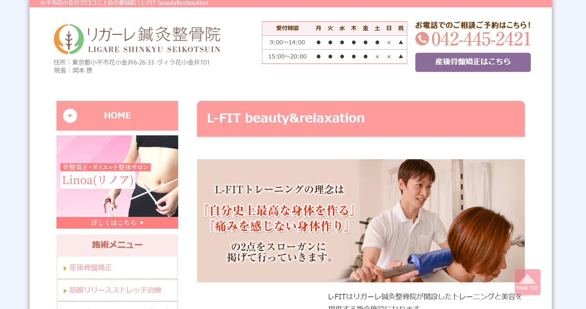 「L-FIT beauty&relaxation」は、リガーレ鍼灸整骨院がプロデュースする複合型パーソナルジムです。整骨院併設ならではの強みとして、トレーニングに「治療」と「美容」を融合。ダイエットはもちろん、痛みがある状態からの機能改善や、産後骨盤矯正、美容鍼を組み合わせたトータルケアが可能です。身体のプロである国家資格者が連携し、不調を整えながら理想の体を目指せる安心感が選ばれる理由です。