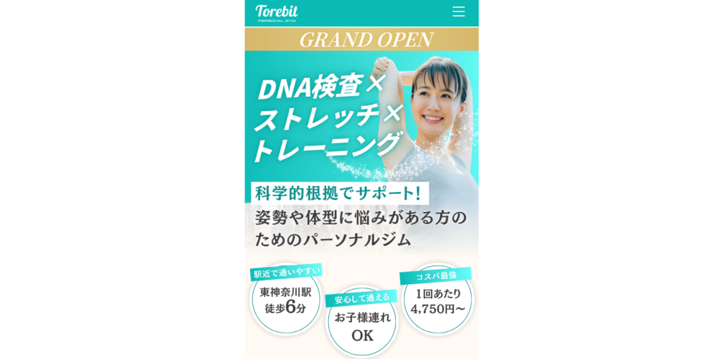 「パーソナルジムトレビット」は、姿勢や体型にお悩みの方におすすめの、女性も安心のパーソナルジムです。DNA検査の結果をもとに、一人ひとりに最適なトレーニングメニューやストレッチ、食事指導を提供しているのが特徴です。ウェアやタオル、サプリメントも無料で用意されており、手ぶらで通えるのも嬉しいポイントです。