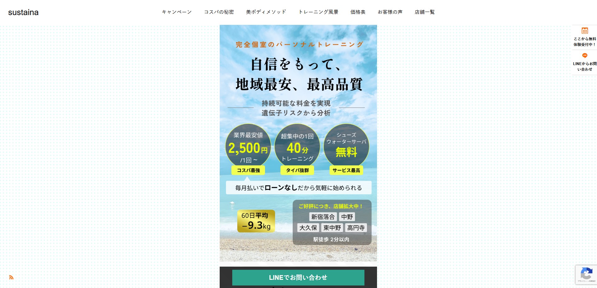 「パーソナルサスティナ 東中野店」は、トレーニングは、手軽で長く続けやすい、持続可能な料金体系を実現しました。 第1に、トレーニングに不必要な高額設備は排除しました。次に、オープンからの退会率が3%以下のため、広告費にお金がかかりません。 削減できた費用の分だけ、お客様に手軽な価格でサービスをご利用頂けるようなシステムとしました。