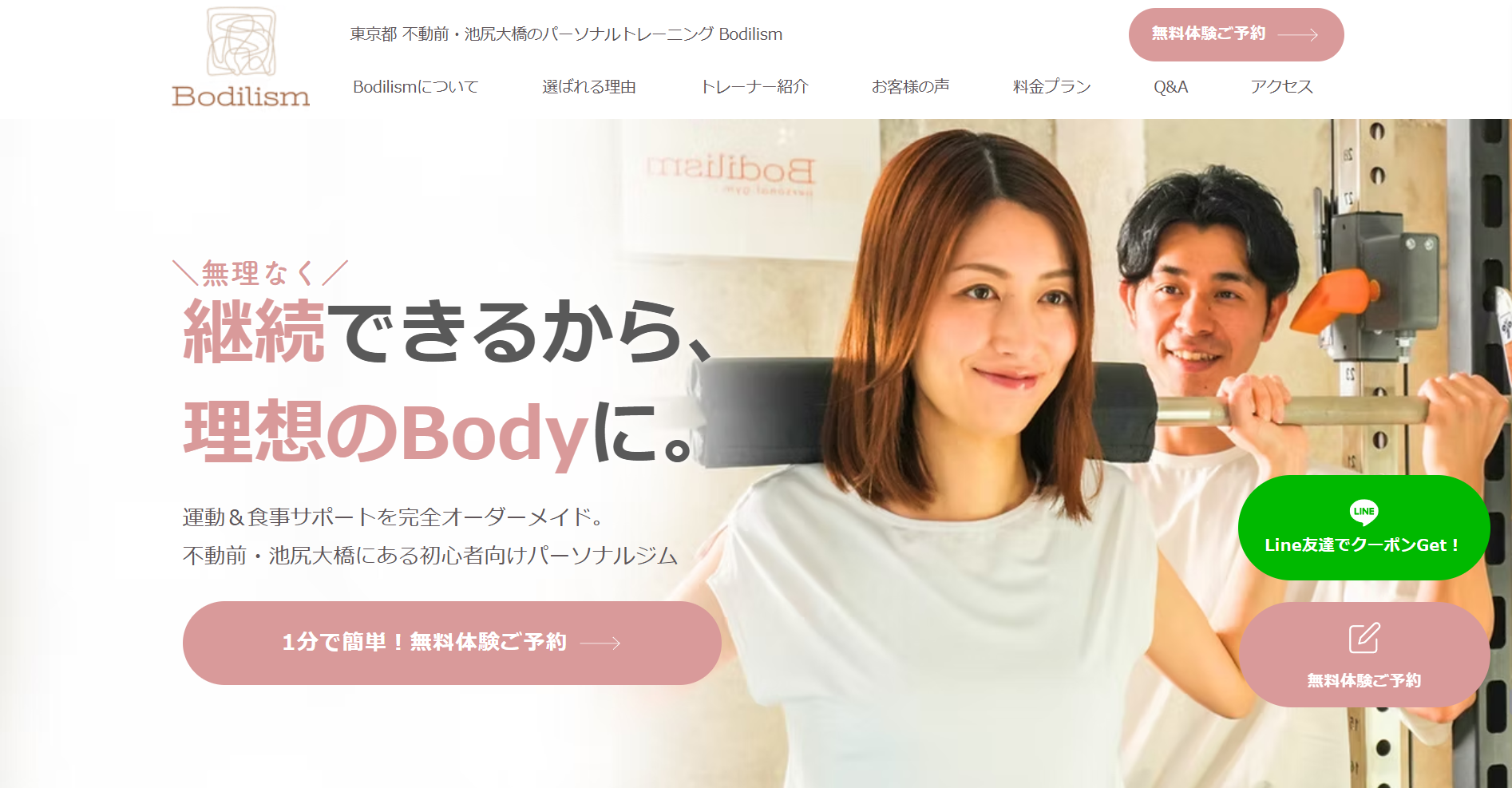 「Bodilism 池尻大橋店」は、30〜40代女性に人気のダイエット特化型パーソナルジム。身体作りのプロの指導が低価格で受けられます。特に食事相談付きで、1回約5,000円で通える3ヶ月集中プランが大好評です。トレーニングは完全個室で、2025年にオープンしたばかりの広く清潔な空間。代表トレーナーは元楽天社員からトレーナーに転身したユニークな経歴を持ち、アットホームで楽しくトレーニング指導を受けられます。お客様の生活スタイルを大切にしながら、無理なく続けられ、一人一人の理想のカラダづくりをサポートします。