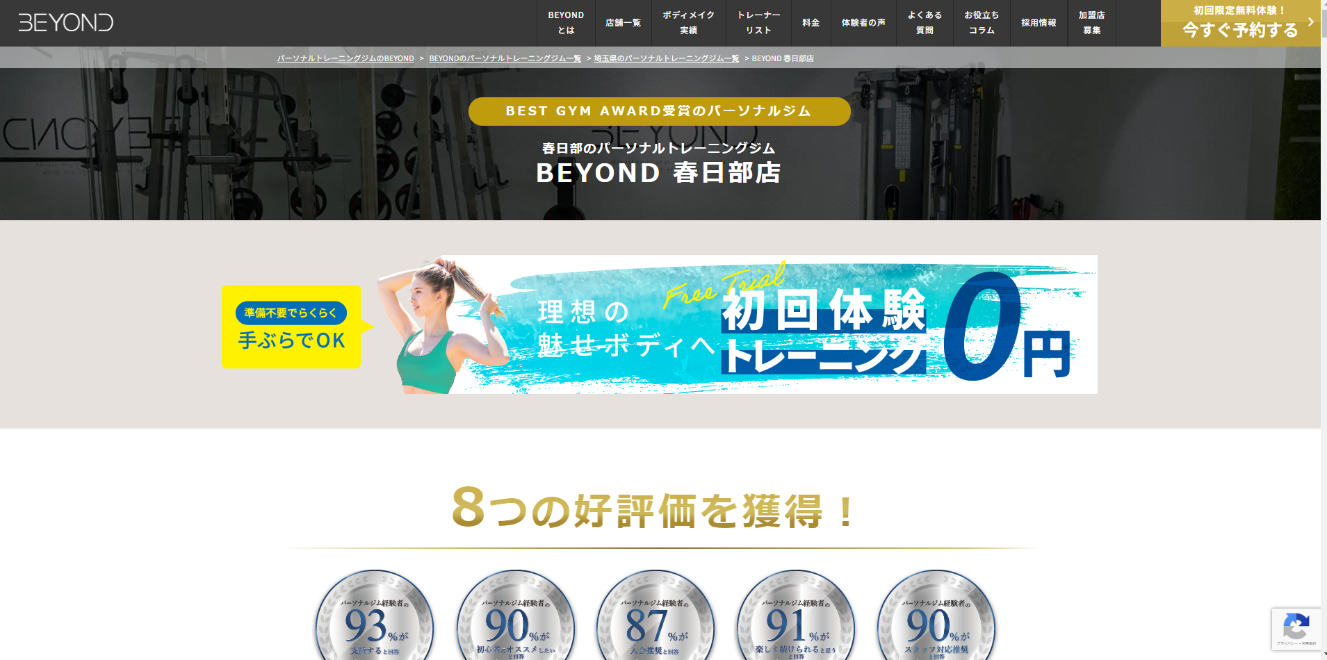 「BEYOND春日部店」はボディコンテストで入賞歴のあるトレーナーのみで構成されているパーソナルジムです。トレーナーの経験を活かしながら、質の高いパーソナルトレーニング、また糖質制限をしない食事指導が受けれる点がおすすめです。
