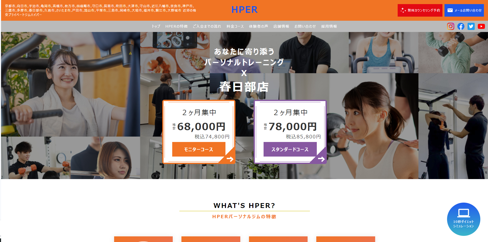 | コース料金 | 【短期集中ダイエットコース】※食事指導込み 1ヶ月 88,000円 2ヶ月 165,000円 3ヶ月 242,000円 【定額コース】※食事指導込み 50分 2回 16,500円 50分 4回 30,800円 |