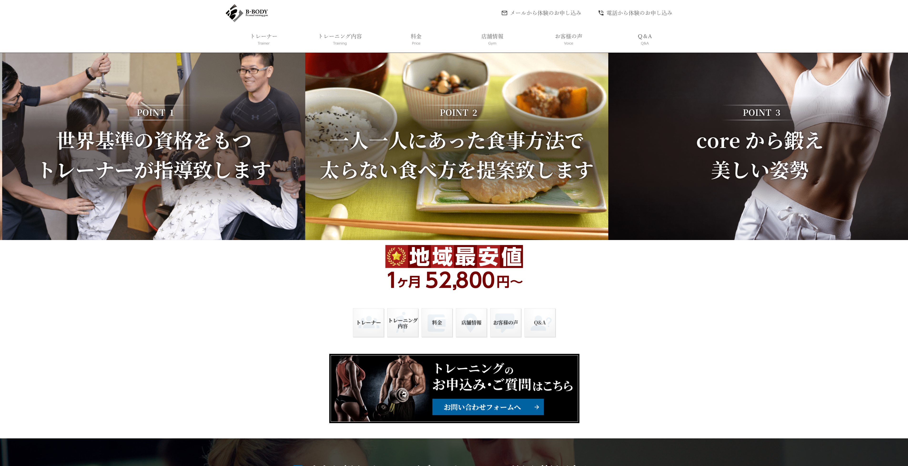 | コース料金 | ■ボディメイキングコース 1回50分(目安回数:1か月4回)マンツーマン食事指導付き 期間限定特別キャンペーン料金 今なら入会金30,000円が0円(税込) 1ヶ月集中コース(4回) 40,000円 16回コース(目安時間:3カ月) 150,000円 ■整体・ボディメンテナンスコース 初回カウンセリング・トレーニング50分・ボディケア70分 1ヶ月集中コース(4回) 40,000円 16回コース(目安時間:3カ月) 150,000円 ■レディスプラン 初回カウンセリング・トレーニング50分・全身リンパ痩身コース70分 1ヶ月集中コース(4回) 40,000円 16回コース(目安時間:3カ月) 150,000円 ■キャンペーン トライアルキャンペーン実施中! 昼割キャンぺーン 新規ご入会の方限定 入会時コース料金より1万円OFF |