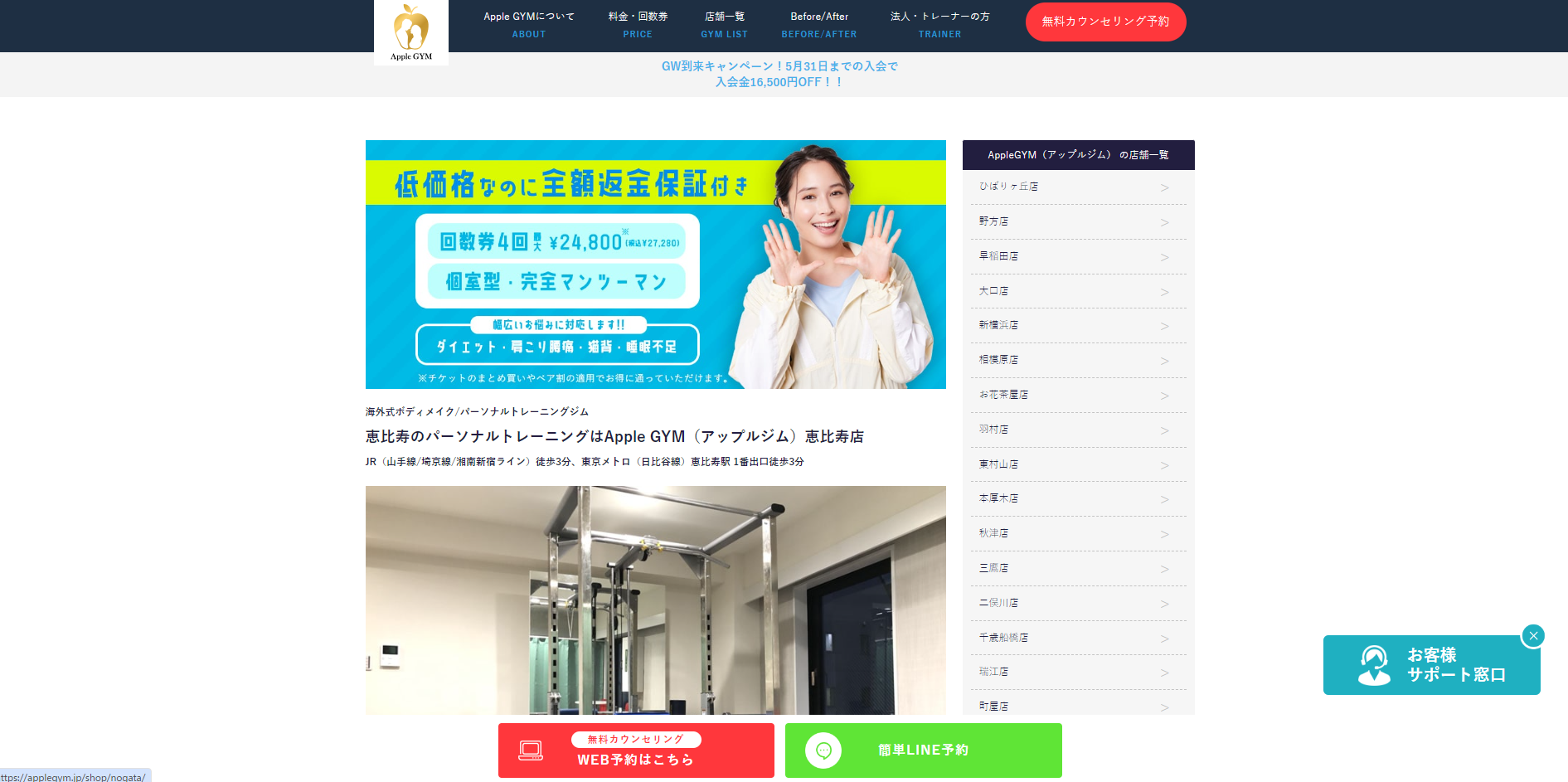 | コース料金 | ■トライアルコース 132,800円(税込)/ 16回 (8,300円/回) パーソナルトレーニング60分 16回 ウェア・水 無料 ■メンテナンスコース 70,400円(税込)/ 8回 (8,800円/回) パーソナルトレーニング60分 8回 ウェア・水 無料 ■スタンダードコース 217,800円(税込)/2ヶ月 パーソナルトレーニング16回 60分 食事指導60日間 ウェア・水 無料 アフターケア ストレッチ付き ■コミットコース 326,700円(税込)/3ヶ月 パーソナルトレーニング24回 食事指導90日間 ウェア・水 無料 アフターケア ストレッチ付き |