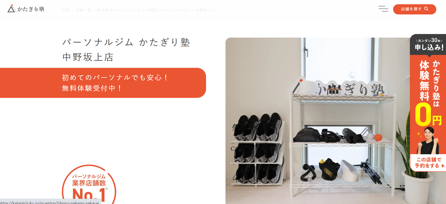 「かたぎり塾 中野坂上店」は、綺麗に痩せることを体験できるパーソナルジムです。独自のプログラムによって、運動・栄養・休養の3つの要素を満たし、それらが習慣化できることを目指します。