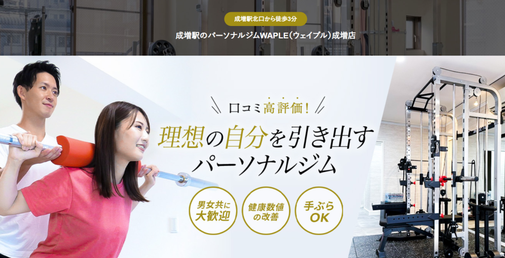 「WAPLE 成増店」は、完全予約制・完全個室のパーソナルジムです。 清潔&広めの個室で、人目を気にせず自分のペースでトレーニングができます。 在籍するトレーナーは全員業界大手パーソナルジム出身でありながら、 大手ジムにはない 「お客様一人一人への寄り添い」 を大事にしております。 「運動したことないけど大丈夫かな…」 「食事制限出来るかな…」 そんなたくさんの不安に寄り添い、ボディメイク・ダイエットを最後までサポートしている点がおすすめです。