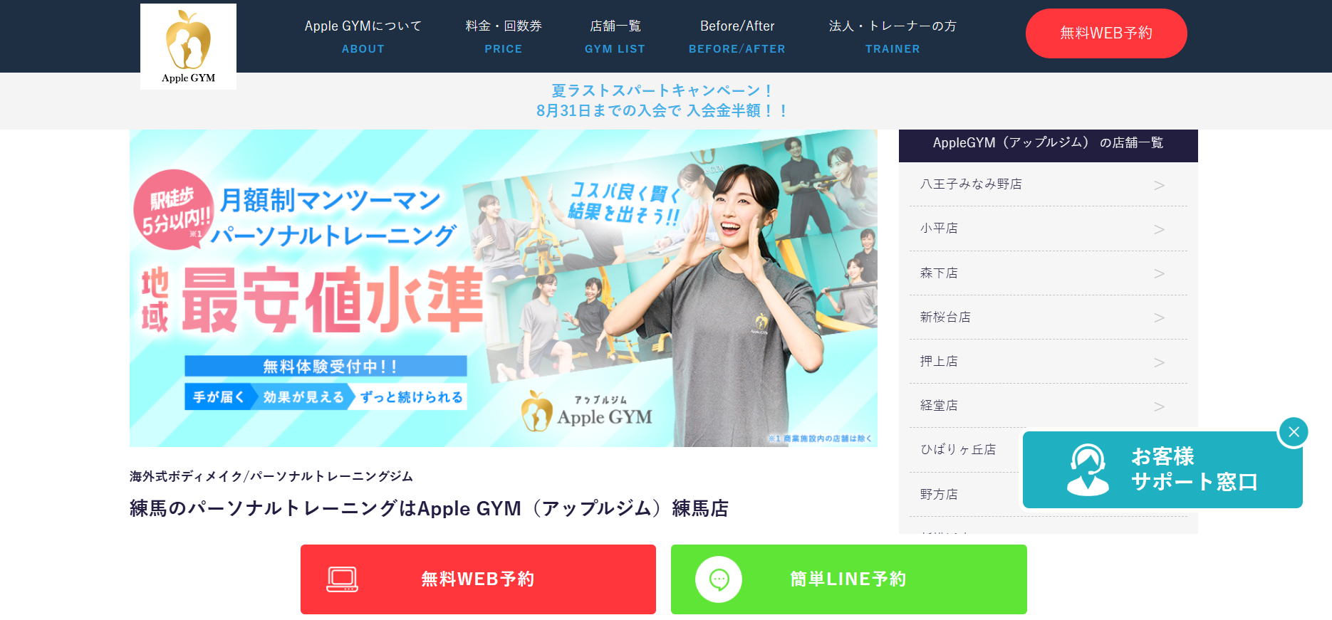 「Apple GYM 練馬店」は、見た目にコミットした独自メゾットの「海外式ボディメイク」が特徴のパーソナルトレーニングジムです。ダイエットだけでなく、姿勢改善や重心改善、欧米人のようなスラっとした体型を目指す方におすすめです。