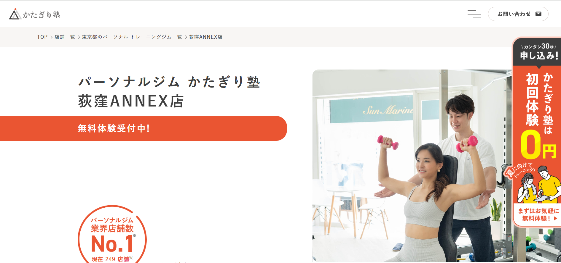 「かたぎり塾荻窪ANNEX店」は、綺麗に痩せることを体験できるパーソナルジムです。独自のプログラムによって、運動・栄養・休養の3つの要素を満たし、それらが習慣化できることを目指します。