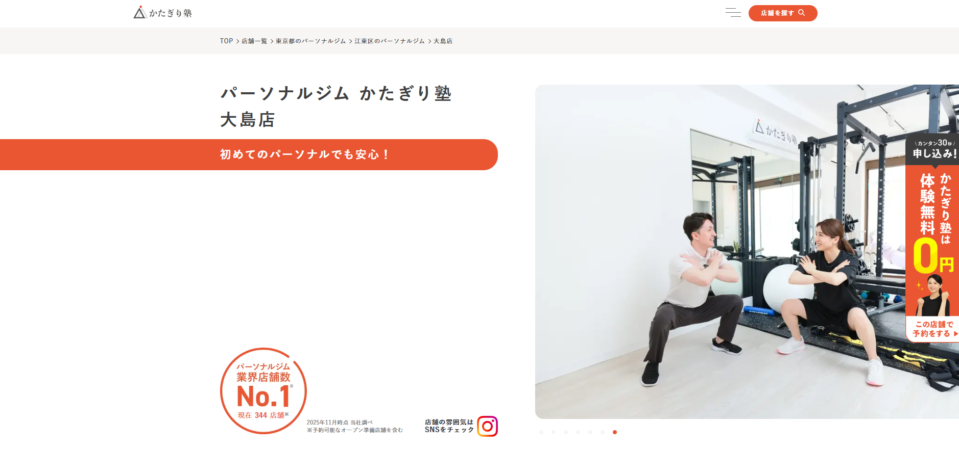 「パーソナルジム かたぎり塾 大島店」は、綺麗に痩せることを体験できるパーソナルジムです。独自のプログラムによって、運動・栄養・休養の3つの要素を満たし、それらが習慣化できることを目指します。