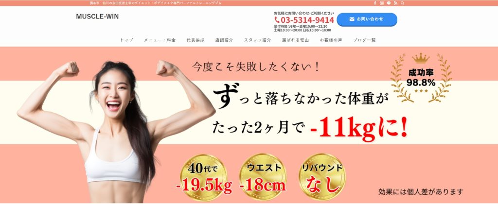 「MUSCLE-WIN」は、当ジムではシドニー五輪レスリング銀メダリストで42歳の最年長優勝記録を持つ永田克彦が生み出した独自のプログラムをマンツーマン指導し、40代、50代の方でもたった2〜3ヶ月でお腹まわりがギュッと引き締まり、体重を最大10Kg以上も落として太りにくいカラダを手に入れていいます。