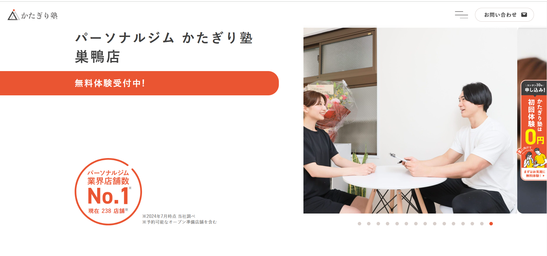 「パーソナルジム かたぎり塾 巣鴨店」は、全国に店舗を展開する、完全個室・マンツーマン指導のパーソナルジムです。最大の特徴は、一流の指導を「業界最安水準」の低価格で提供している点。月額制で契約期間の縛りがないため、初心者でも安心して始められます。理学療法士が監修した科学的根拠に基づく指導で、無理なく「綺麗なダイエット」を実現。ウェア無料貸出やトレーニング後のプロテイン無料などサービスも充実しており、続けやすさが選ばれる理由です。