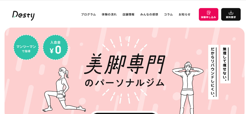 「美脚専門パーソナルジムDesty横浜店」は、今までパーソナルトレーニングジムに通ったけど脚が細くならなかった。ダイエットをして体重を落としたのに下半身があまり変わらなかった。 Destyではこのような下半身のお悩みに特化した独自のメソッドで、お客様の脚をまっすぐ引き締まった美脚に導きます。