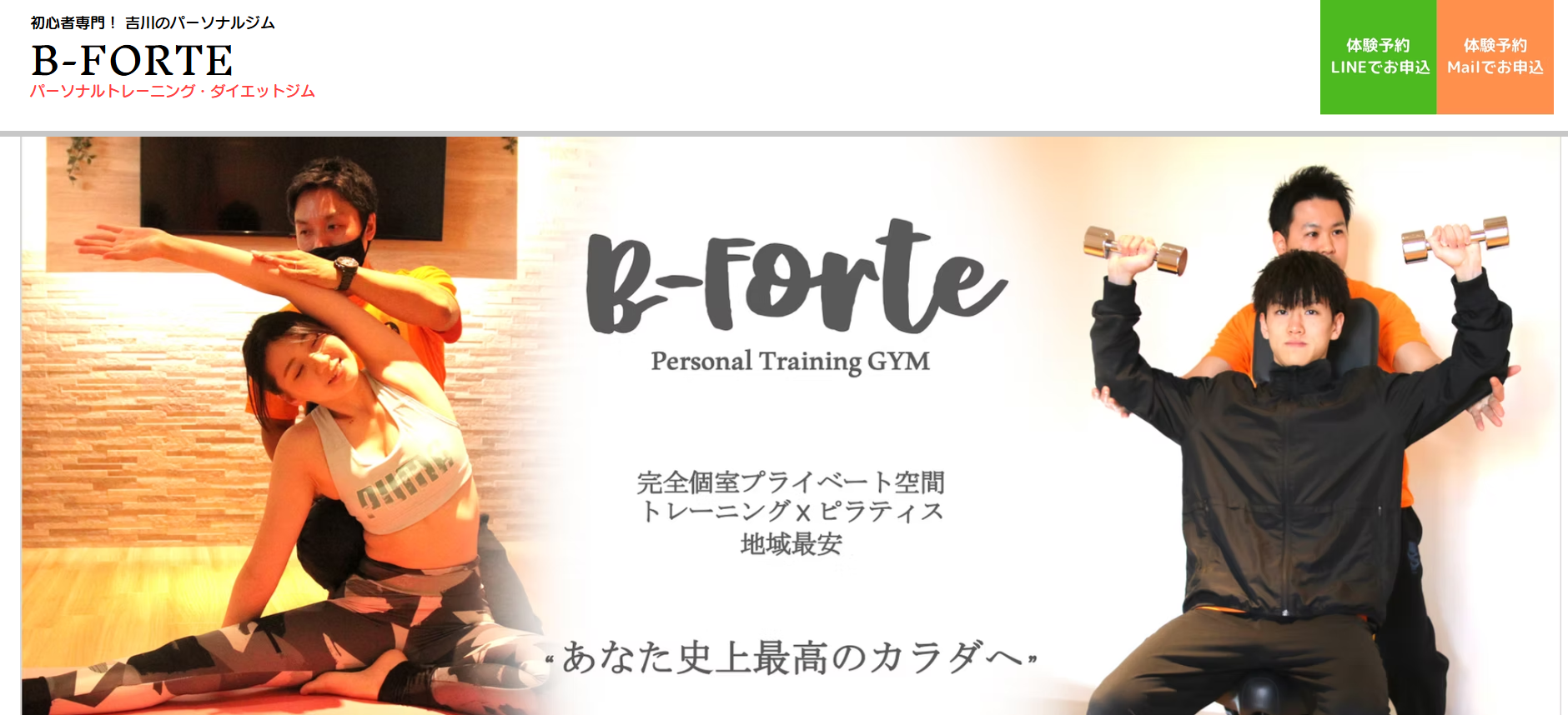 「B‑FORTE(ビフォルテ)」は、吉川駅徒歩1分の完全個室パーソナルジム。初心者専門で、ピラティスとウエイトトレーニングを組み合わせた独自メソッドにより、姿勢改善やボディメイクを効率的にサポート。経験豊富なトレーナーが丁寧に指導し、24時間ジムも併設で継続しやすい環境が整っています。